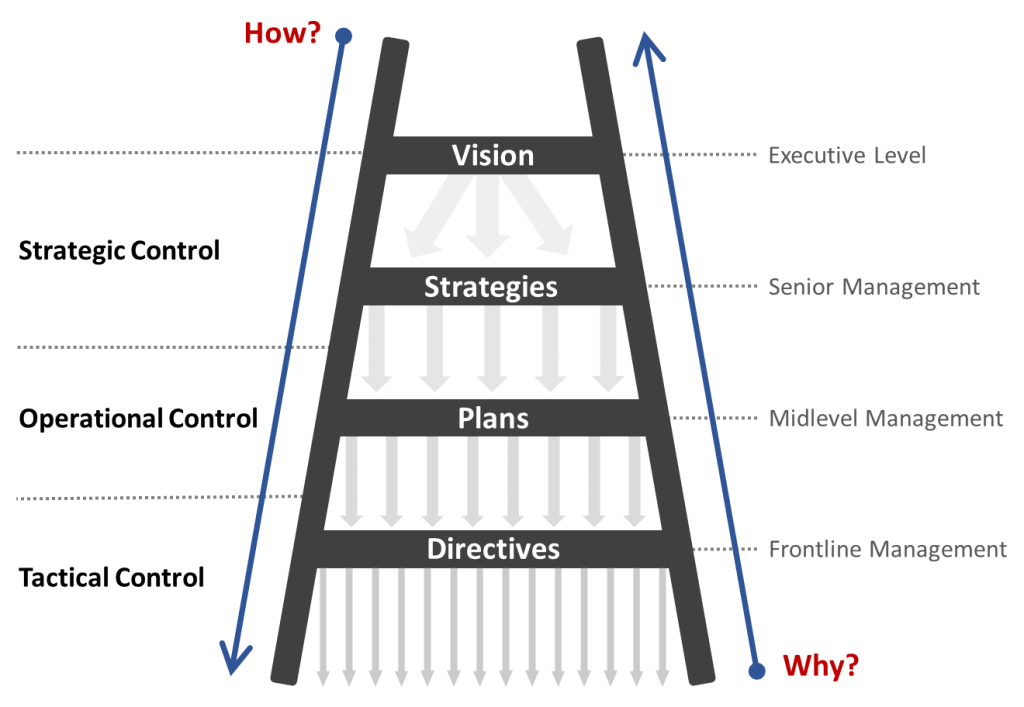 As we progress down the diagram we uncover the answer to the ‘how’ questions. For example, ‘how will we implement our Strategy?’ is answered by the multitude of Plans sitting below this Strategy. Likewise, the daily Directives you give should always provide an answer to the question of, ‘how will we complete this Plan?’.